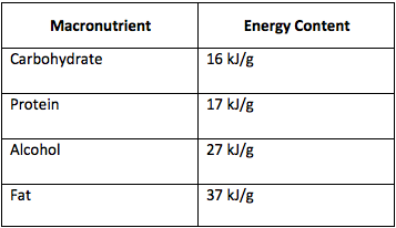 The food we eat contains varying amounts of energy depending on how much fat, carbohydrates, protein or alcohol it contains. Each gram of fat provides 37kJ in comparison to carbohydrates and proteins, which contain 16kJ and 17kJ respectively. Alcohol contains 27kJ/g.
