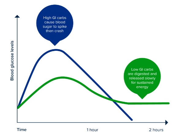 High GI carbohydrates are quickly digested and absorbed, causing a quick increase in blood sugar levels followed by a quick drop. Carbohydrates with a low GI are a better choice as they are slowly digested and absorbed, producing a slow rise in blood sugar levels. This helps to give us long-lasting energy and keeps us feeling fuller for longer.