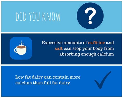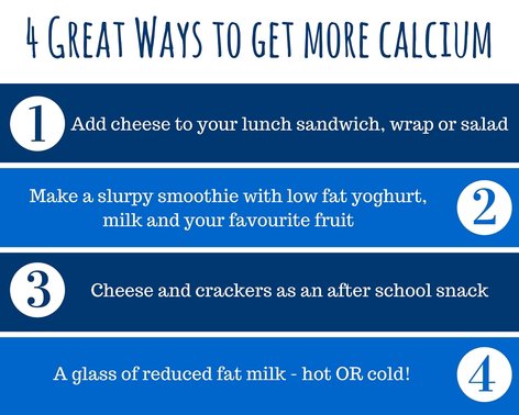 It is important to include calcium foods to build your bones while you’re still growing. Not getting enough calcium in your diet can make your body draw calcium from your bones, which makes them weaker and more easily broken! Not enough calcium at a young age can lead to problems later in life such as osteoporosis, a condition characterised by weak bones.