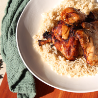 Serve one piece of chicken with 1⁄2 cup cooked brown rice, drizzled with the cooked sauce from the grill pan.