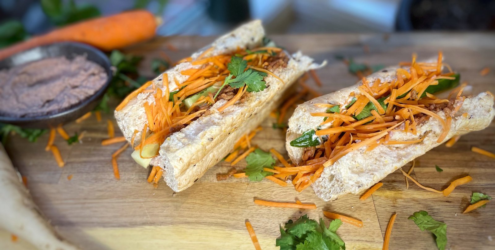 4Assemble the bahn mi: Spread pate on the base of each bread roll. On the other side of the inside of the roll, spread some mayonnaise.