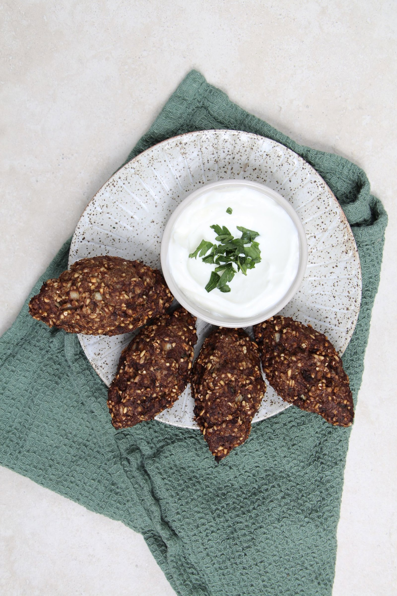 Serve the kibbeh warm with two dollops of the yoghurt mixture on the side.