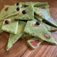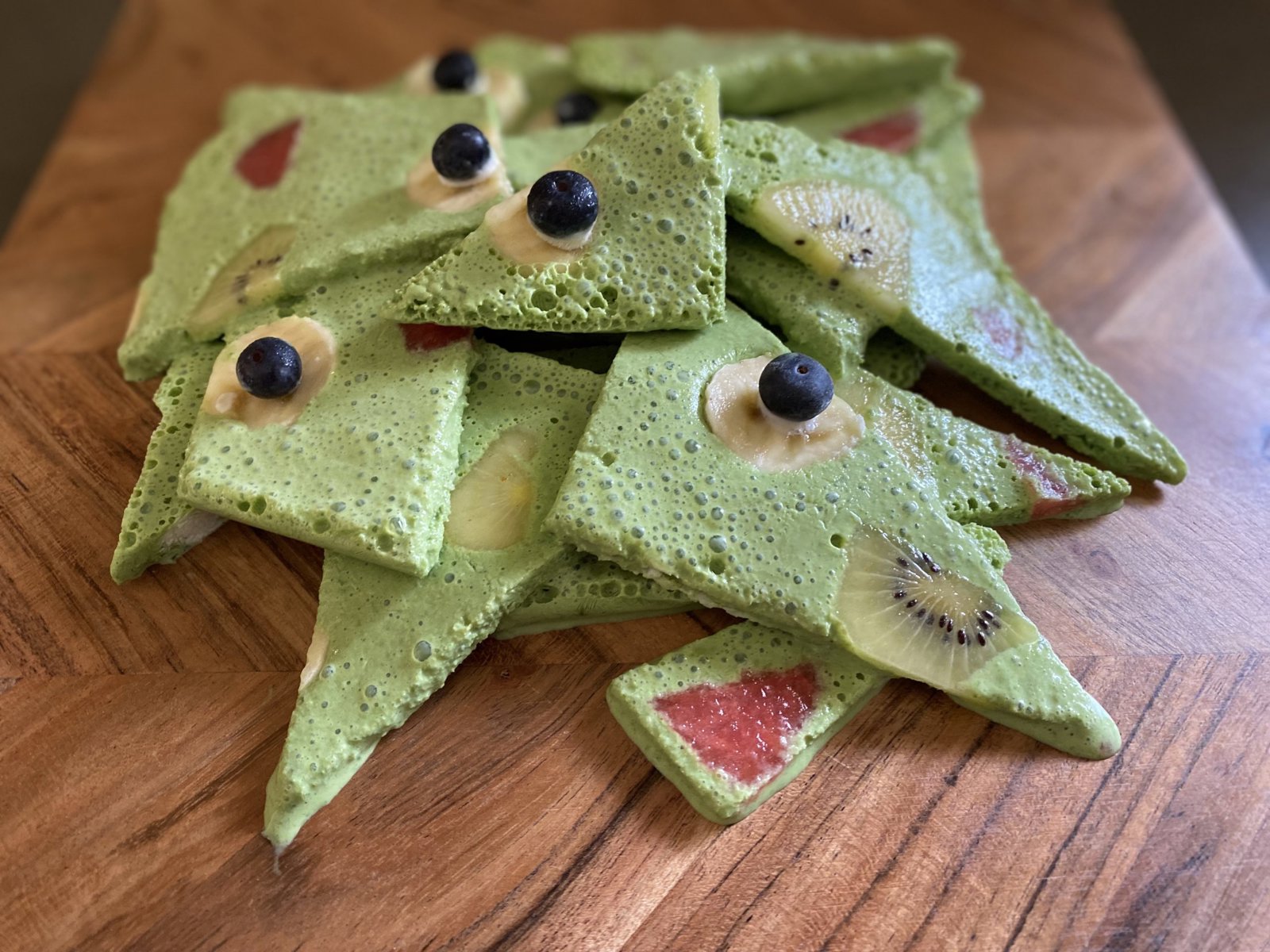 Arrange kiwi fruit, banana and watermelon on top of green mixture.