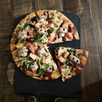 Top the pizza with mushrooms, tomato and greens, followed lastly with the cheese.