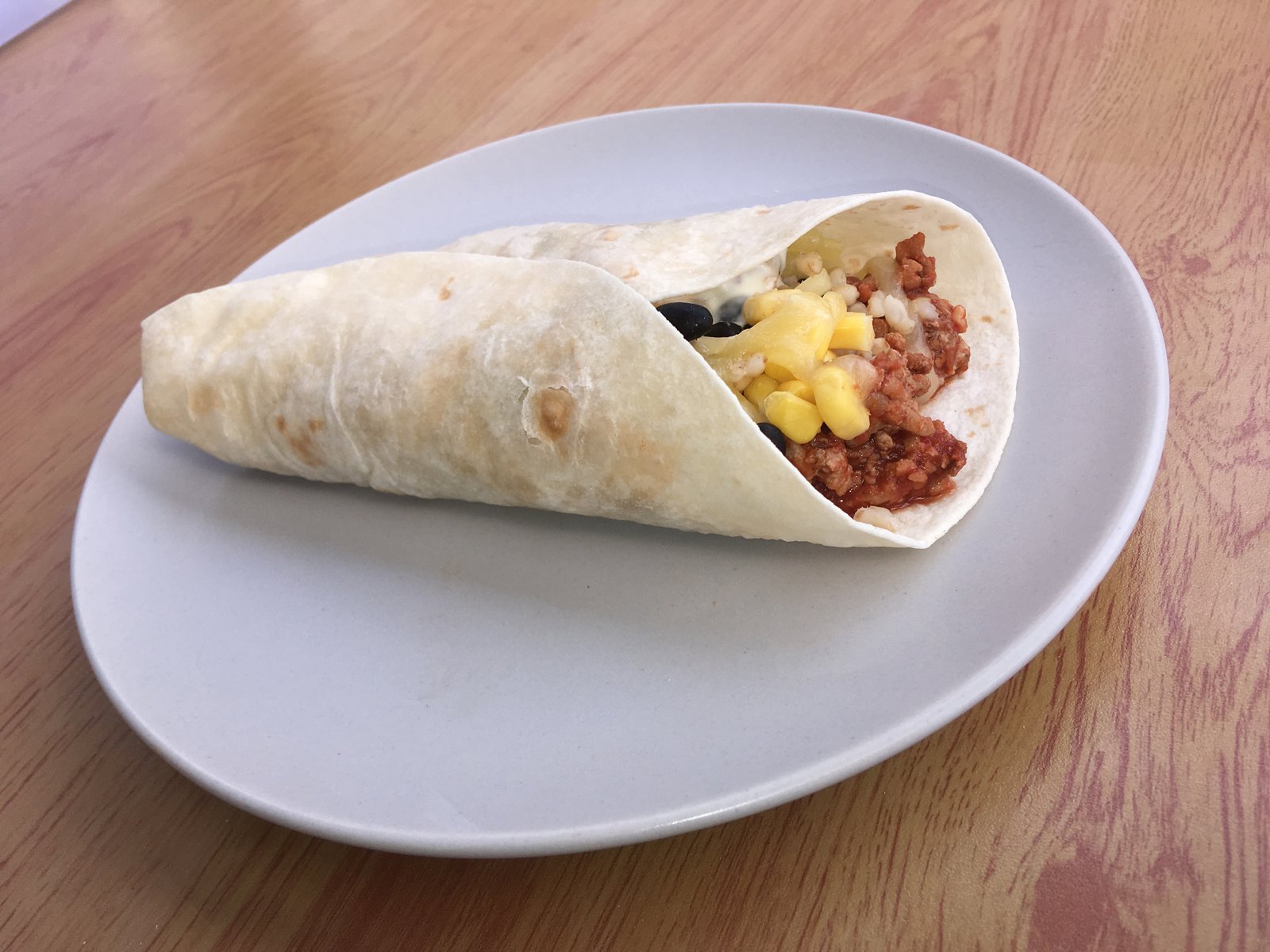 Place 1 tablespoon each of the beans, rice and corn on each tortilla.
