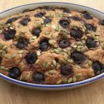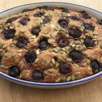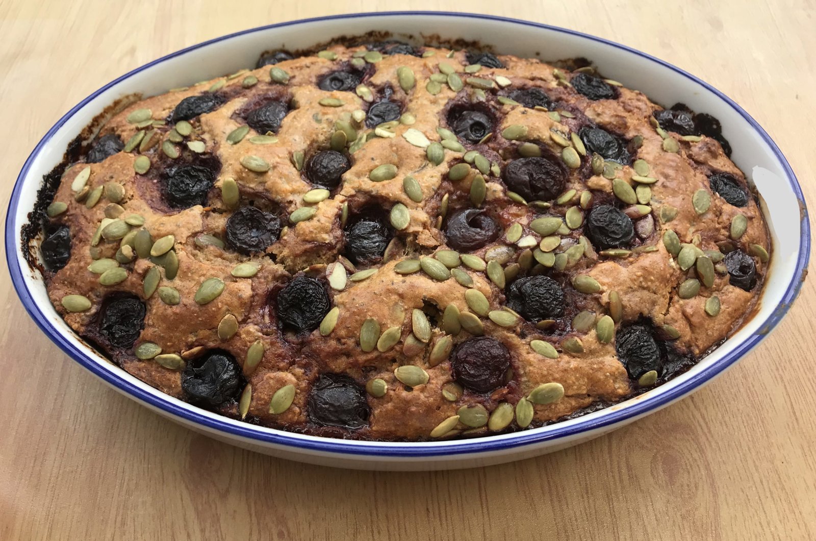 Pour the mixture into the cake tin and sprinkle with the remaining sunflower seeds and pumpkin seeds. Lay the cherries on top, cut side face up.