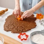 Use a floured rolling pin to roll out the dough until it is about ½ cm thick. Use your favourite Christmas cookie cutters to cut out the dough into cookies (re-rolling the dough and re-flouring the rolling pin as you need to).