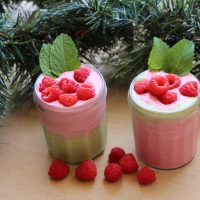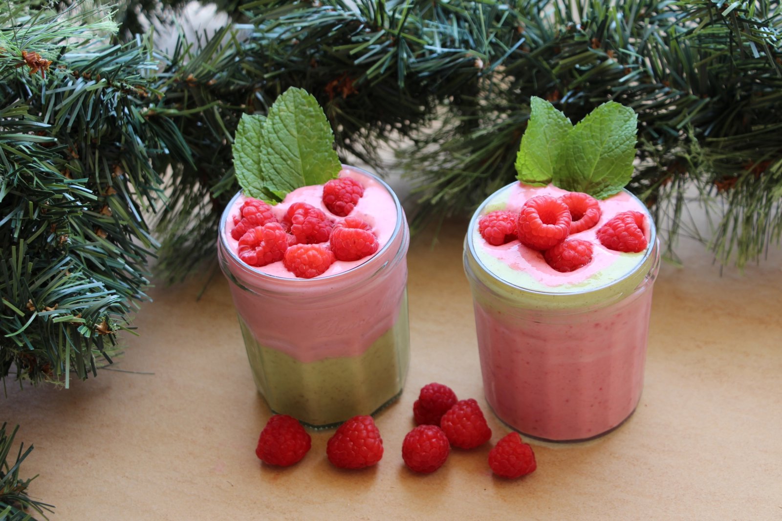 Take the cups from the freezer, then evenly distribute the kiwifruit mixture on top of the strawberry/raspberry mixture.