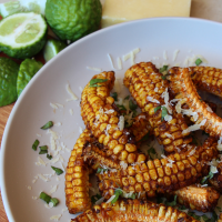 Using a pastry brush, brush the spiced oil onto the corn pieces and lay them on a baking tray lined with baking paper.