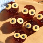 Use a straw to push a hole in the slice of each banana (you can do multiple slices at once!). Lay 2 slices of banana on top of each cup of jelly, then place a blueberry in the hole of each banana slice.