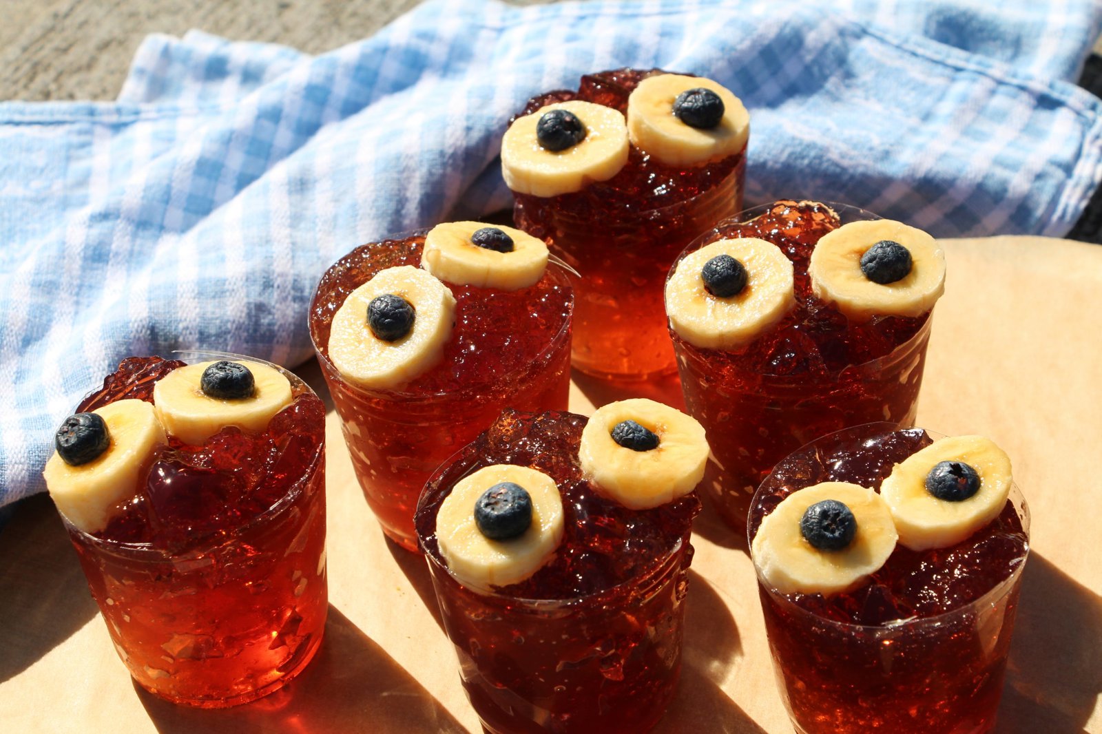 Use a straw to push a hole in the slice of each banana (you can do multiple slices at once!). Lay 2 slices of banana on top of each cup of jelly, then place a blueberry in the hole of each banana slice.