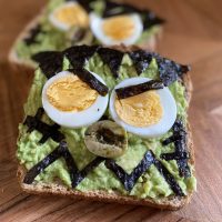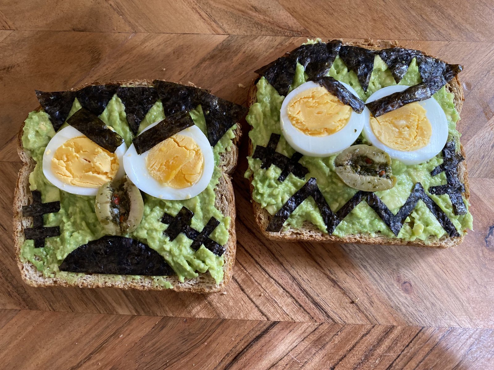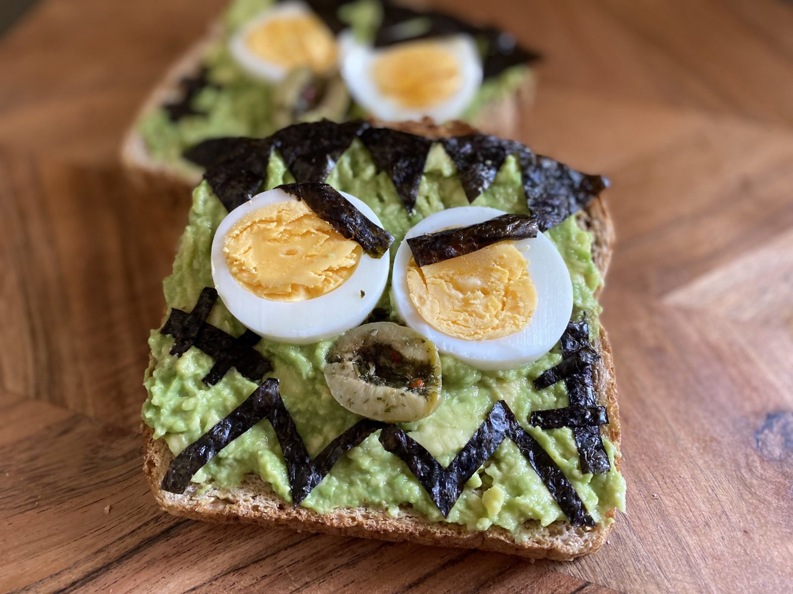 Top each piece of toast with 2 slices of hard-boiled egg to make the eyes.