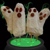 Place bananas on a tray lined with baking paper and press sultanas on to each banana - two for the eyes and one for the mouth.