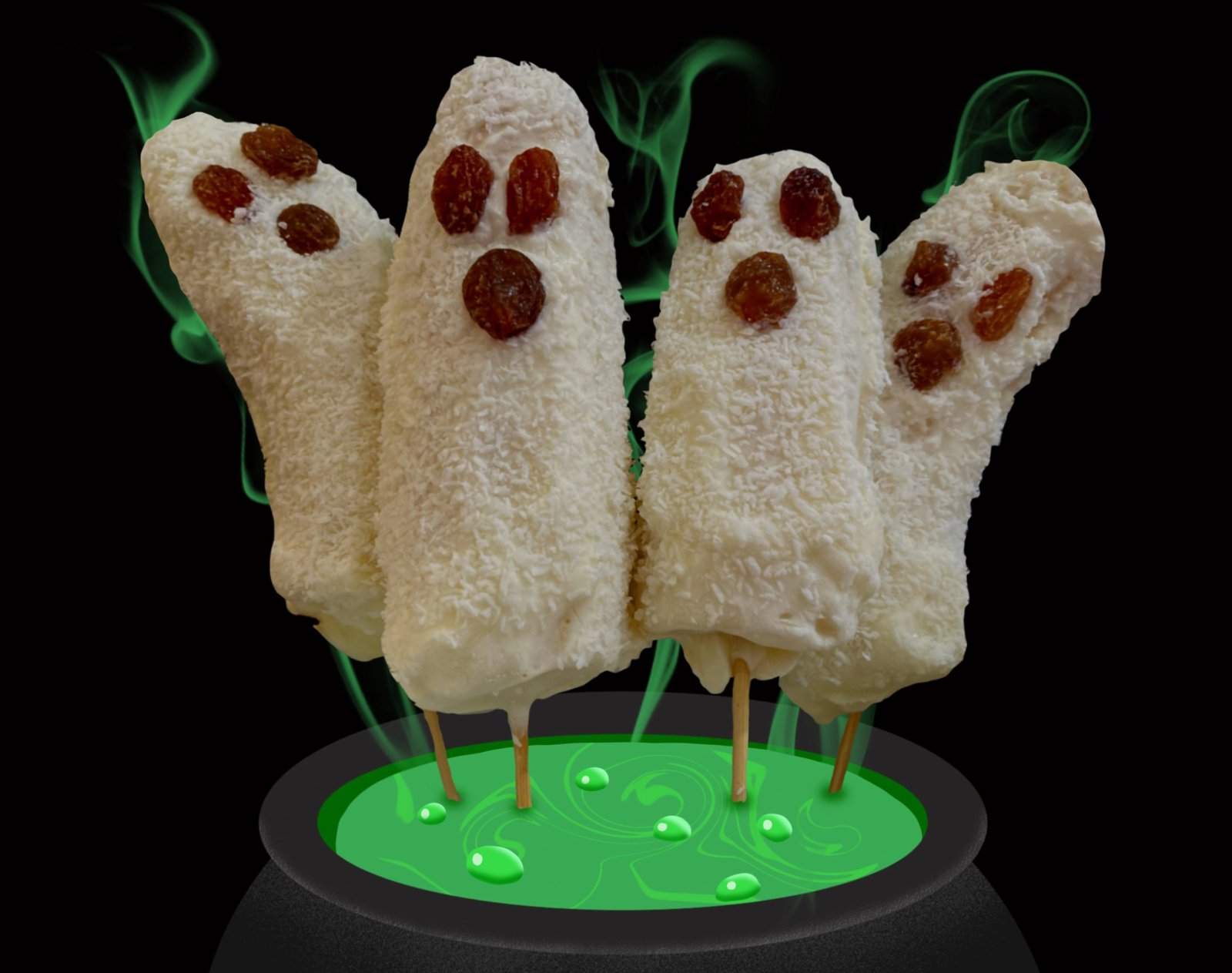 Cut bananas in half and insert popsicle stick or skewer into the cut end of each banana.