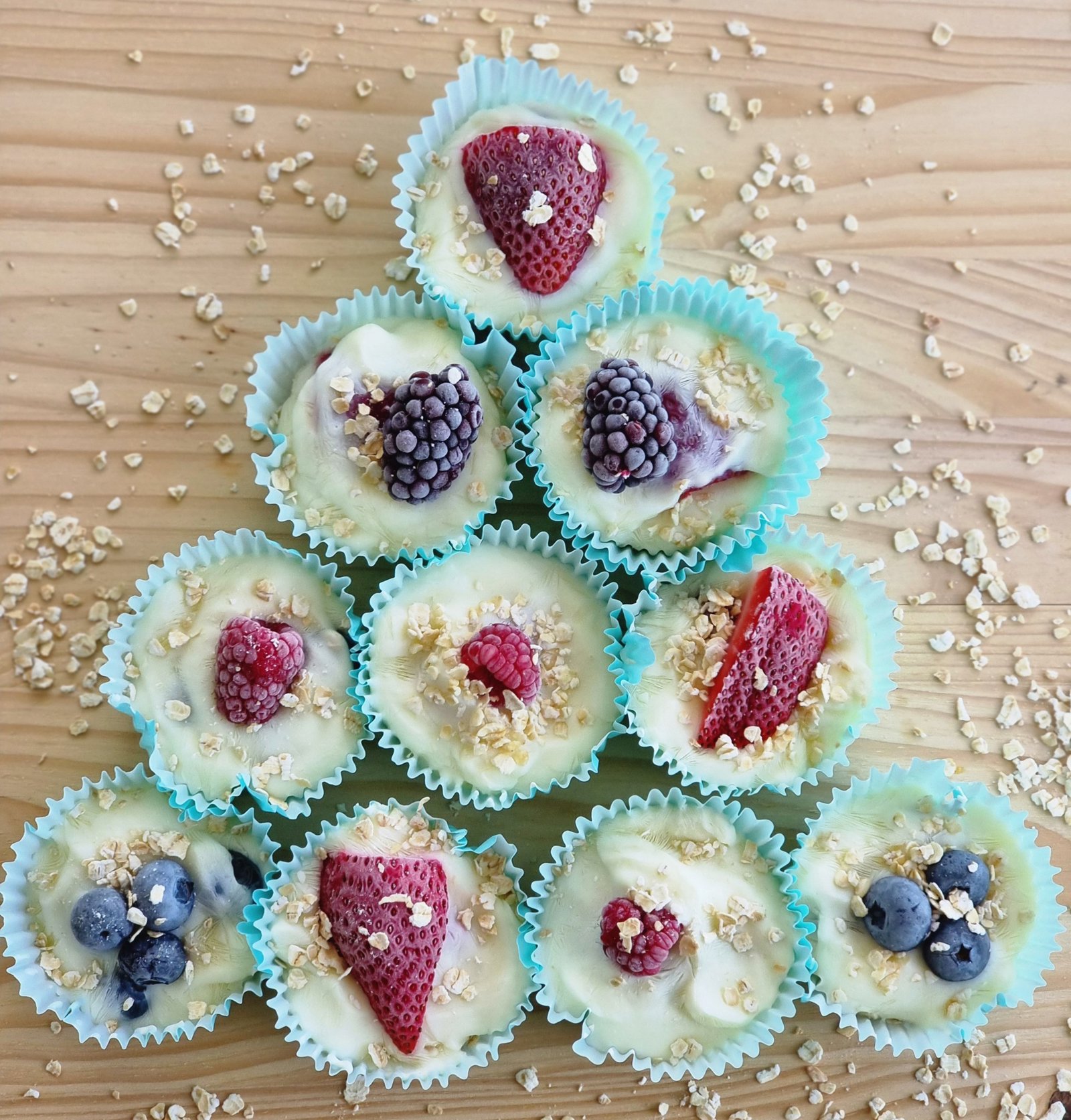 Evenly distribute the remaining yoghurt on top of the fruit in each case.