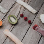 Cut the fruit into small chunks or slices and place it evenly into the moulds/Zip Pop bags* or paper cups, filling them about half way.