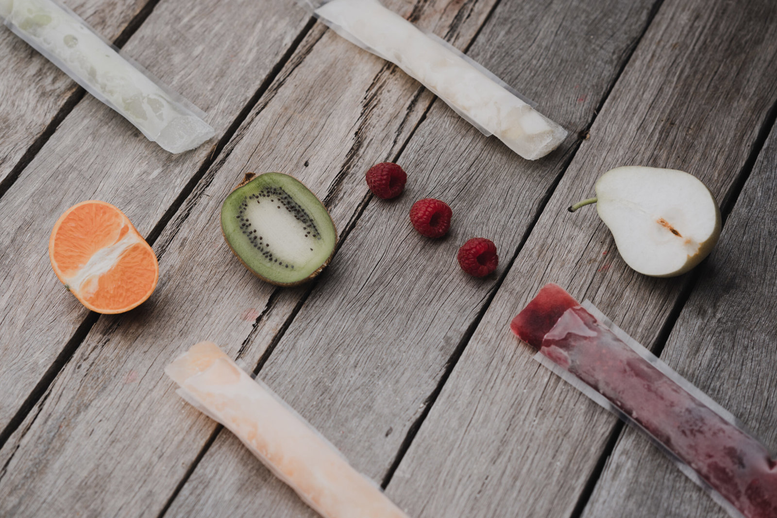 Cut the fruit into small chunks or slices and place it evenly into the moulds/Zip Pop bags* or paper cups, filling them about half way.
