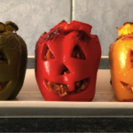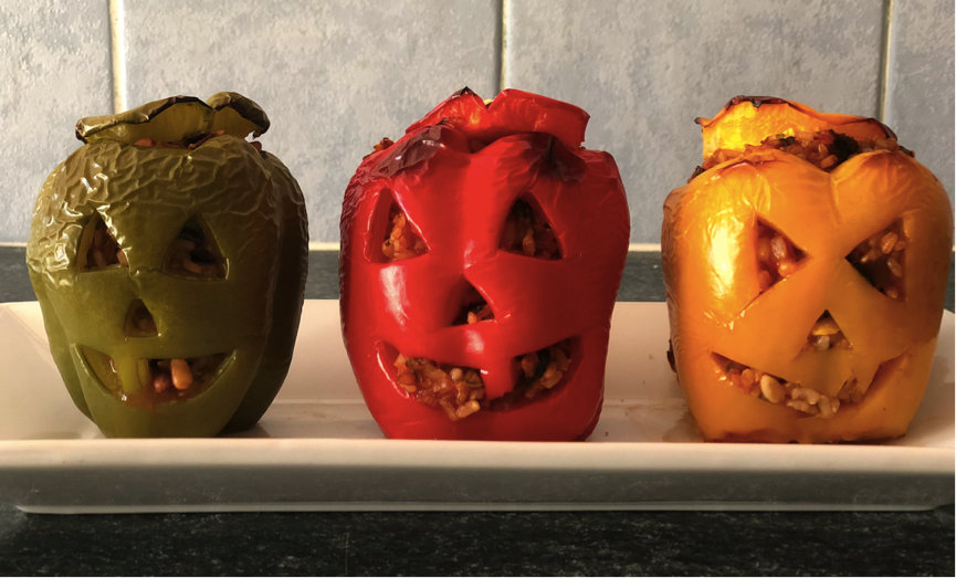 Cut the tops off the capsicums (don't throw them away, these will be the 'lids'!), remove the seeds and any white flesh from inside. Using a small sharp knife, carve spooky Halloween faces into the sides of the capsicums.