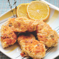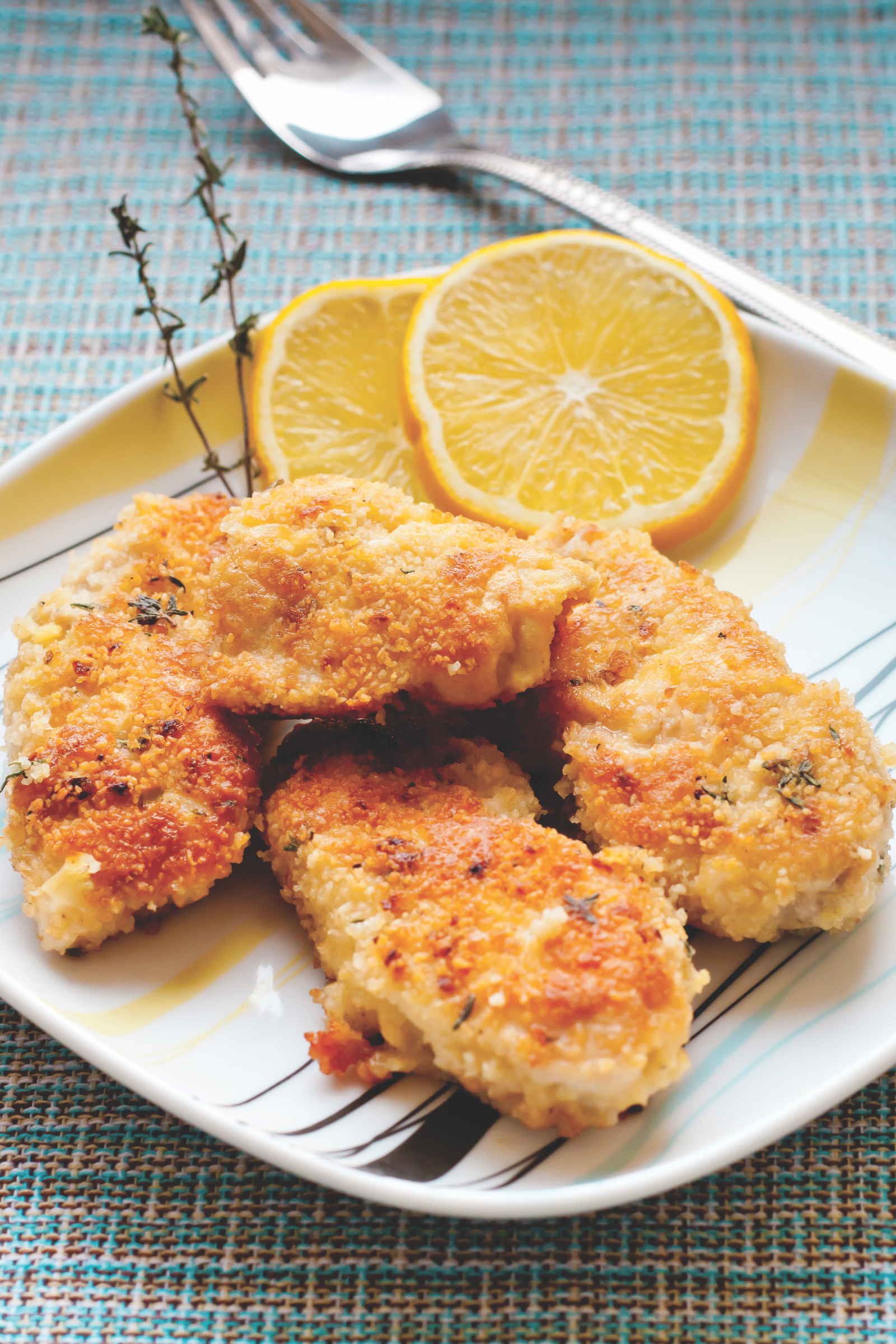 Dip each floured chicken piece first in the egg mixture and then the breadcrumbs, then lay on a tray lined with baking paper.