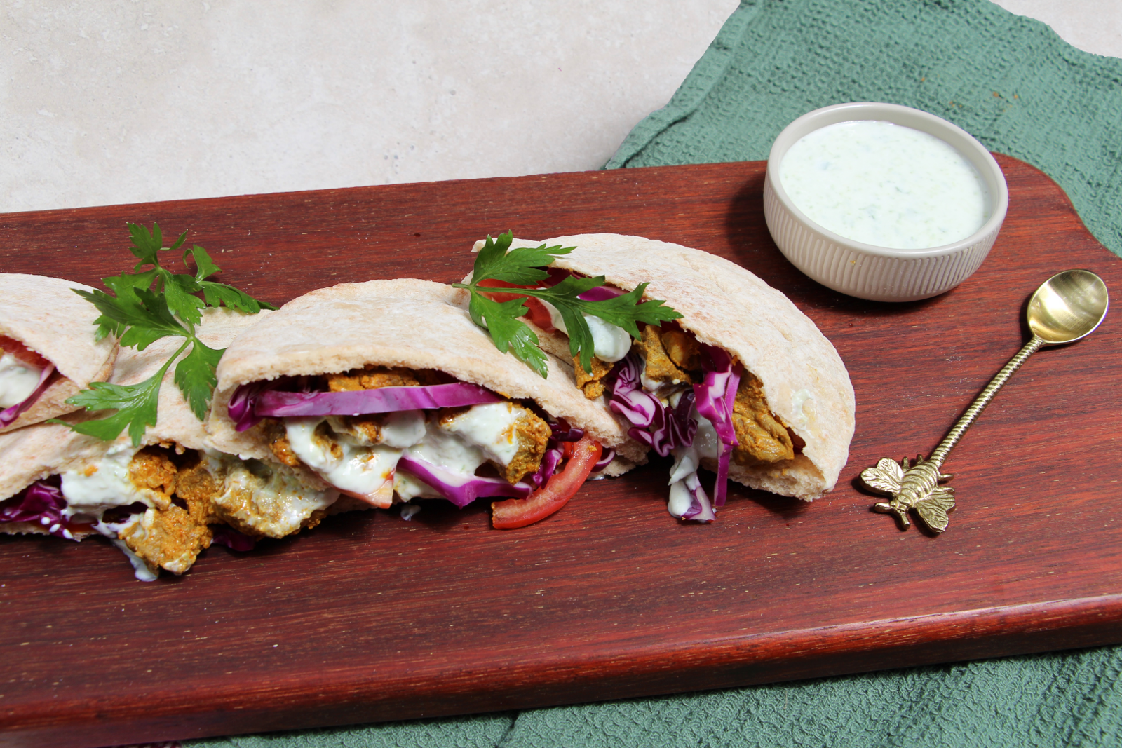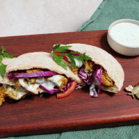 Place the cabbage and tomatoes in the half open pockets, top with the grilled lamb and drizzle each pocket with the sauce.