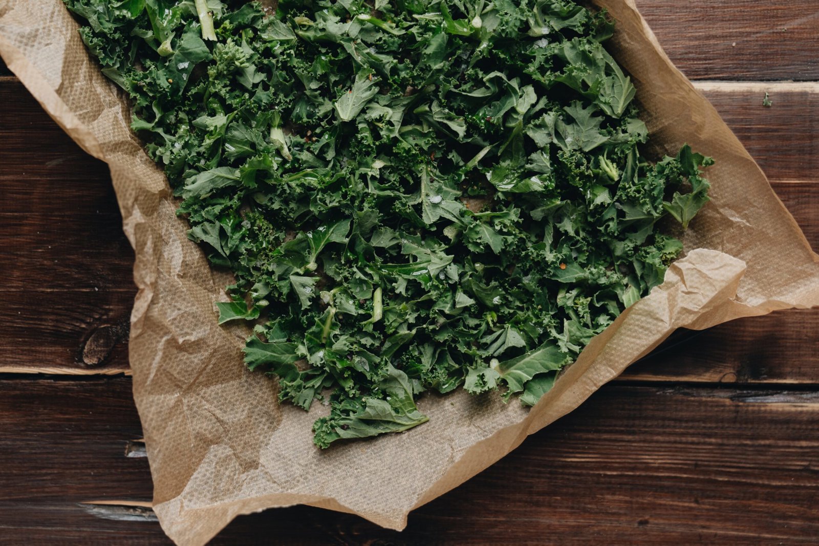 Line a baking tray with baking paper and spread the kale leaves evenly on the tray ensuring none are overlapping.