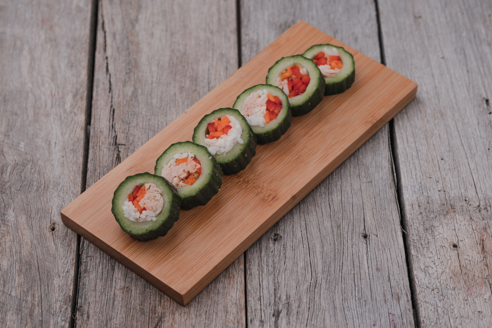 Cut each cucumber roll into sushi length slices (~2cm) or leave is as a sushi roll (~10cm).