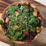 In a separate pan, fry the tofu over high heat in the remaining oil until golden brown.