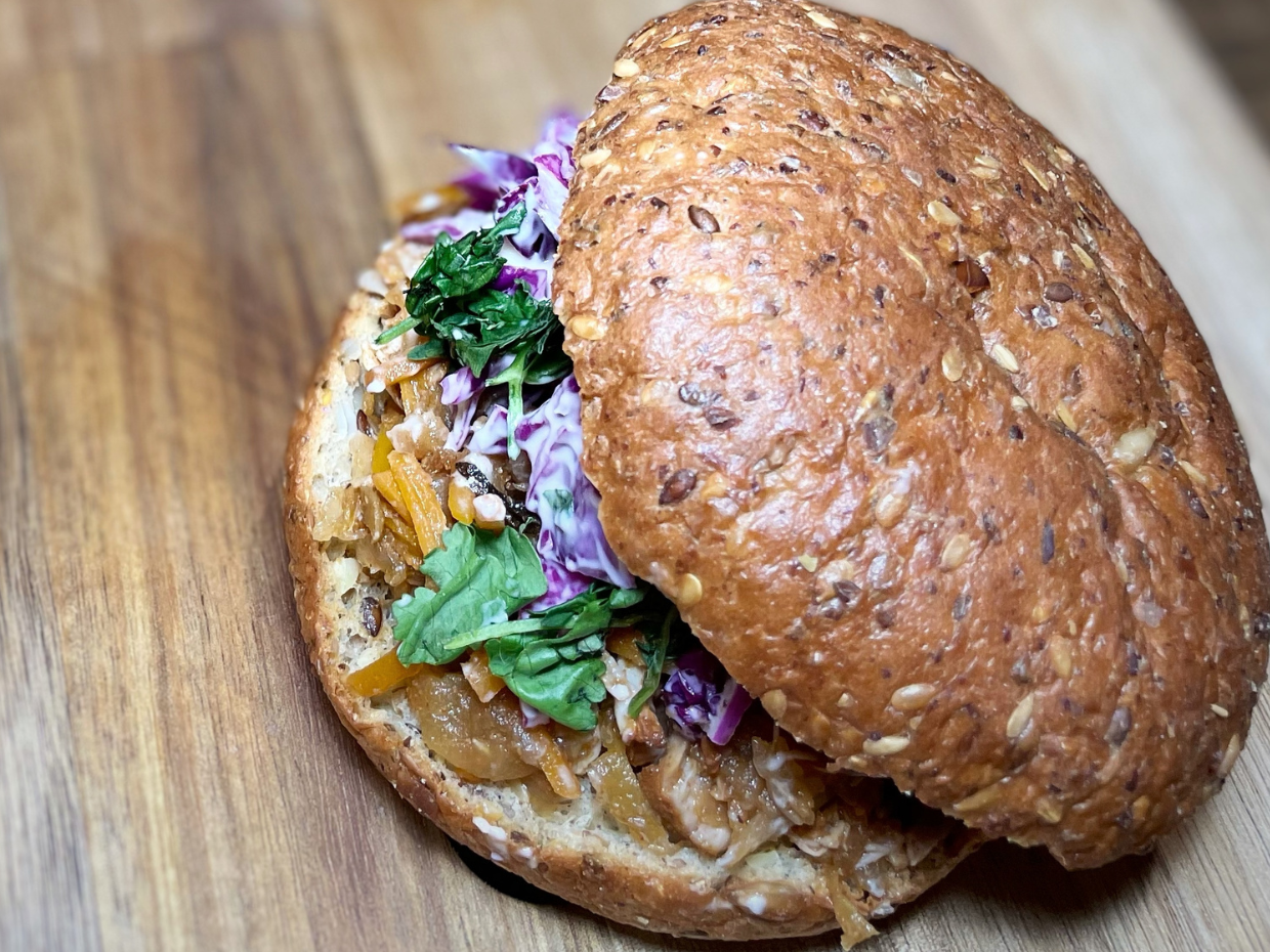 Check on the pork. If it is soft enough to pull apart with a fork it is ready. Pull the pork with two forks and stir through the BBQ sauce and apple cider vinegar.