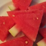 Option 1: Slice the watermelon into triangles of 2cm thickness and 10cm base width, leaving the rind on. Cut a slit in the bottom of the rind, and push a wooden stick in the bottom (see picture 1)