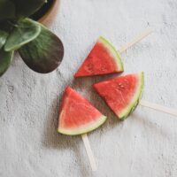 Option 1: Slice the watermelon into triangles of 2cm thickness and 10cm base width, leaving the rind on. Cut a slit in the bottom of the rind, and push a wooden stick in the bottom (see picture 1)
