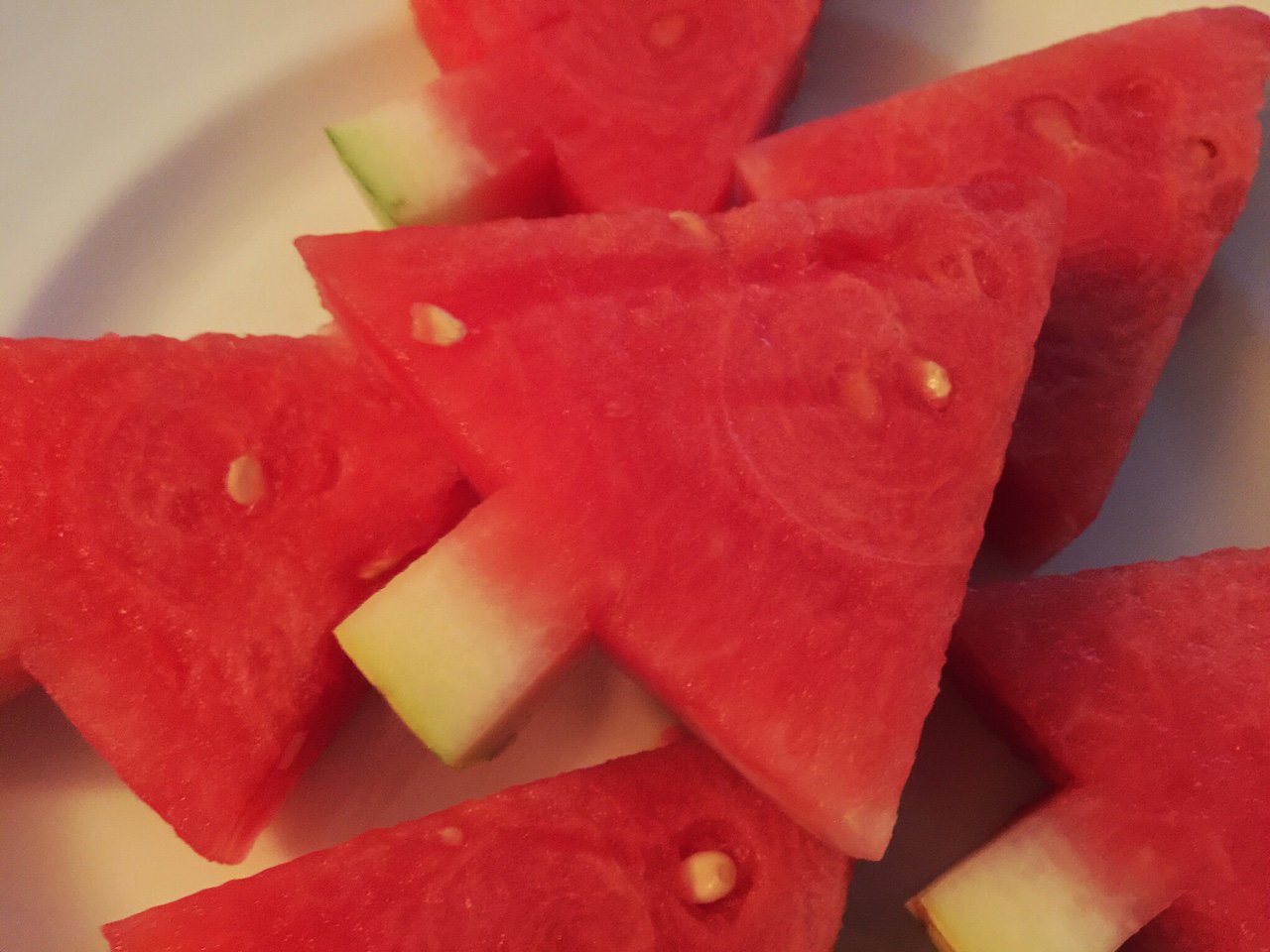 Option 2: Slice the watermelon into triangles of 2cm thickness and 10cm base width, leaving the rind on. Trim the rind off each triangle, except for in the middle where you leave a square of green rind to create a 'tree stump' (see picture 2)