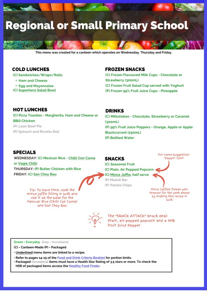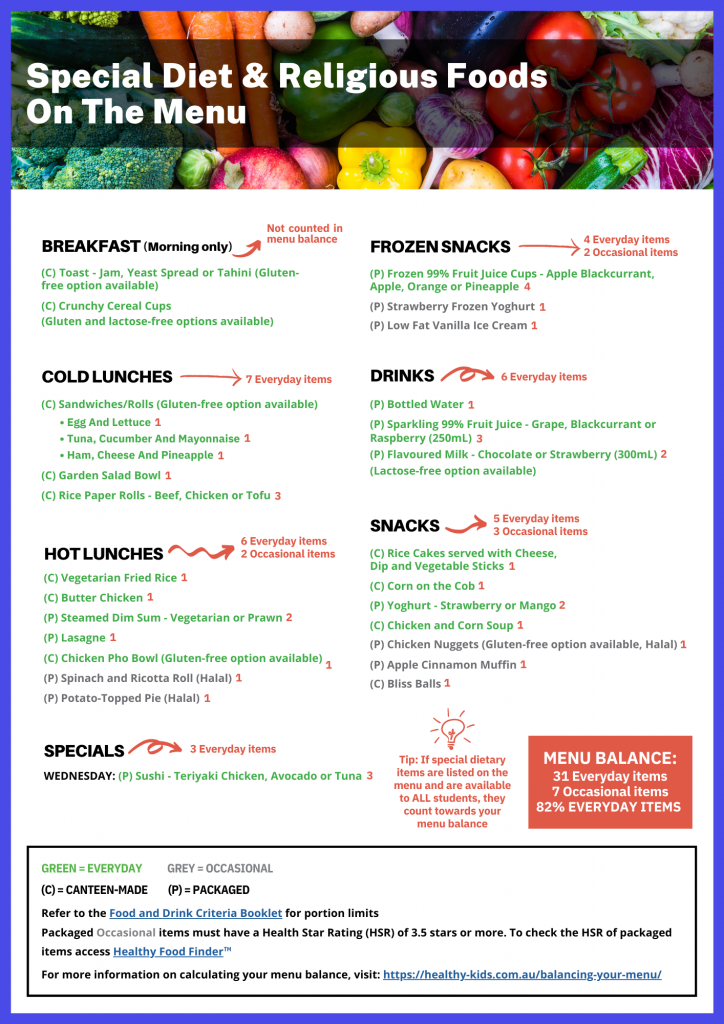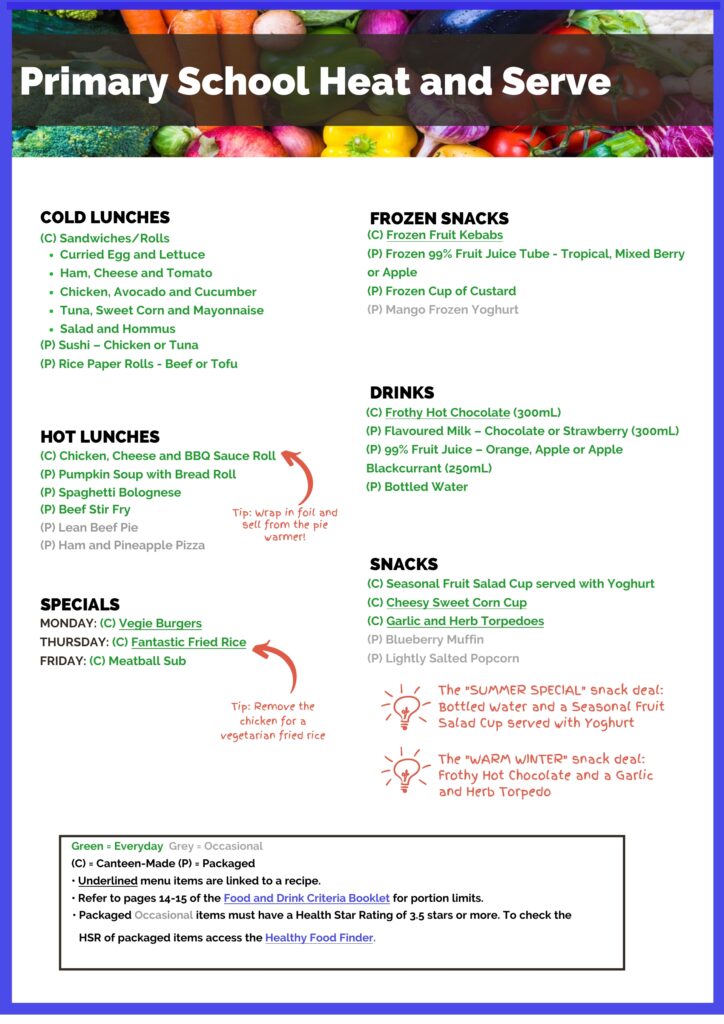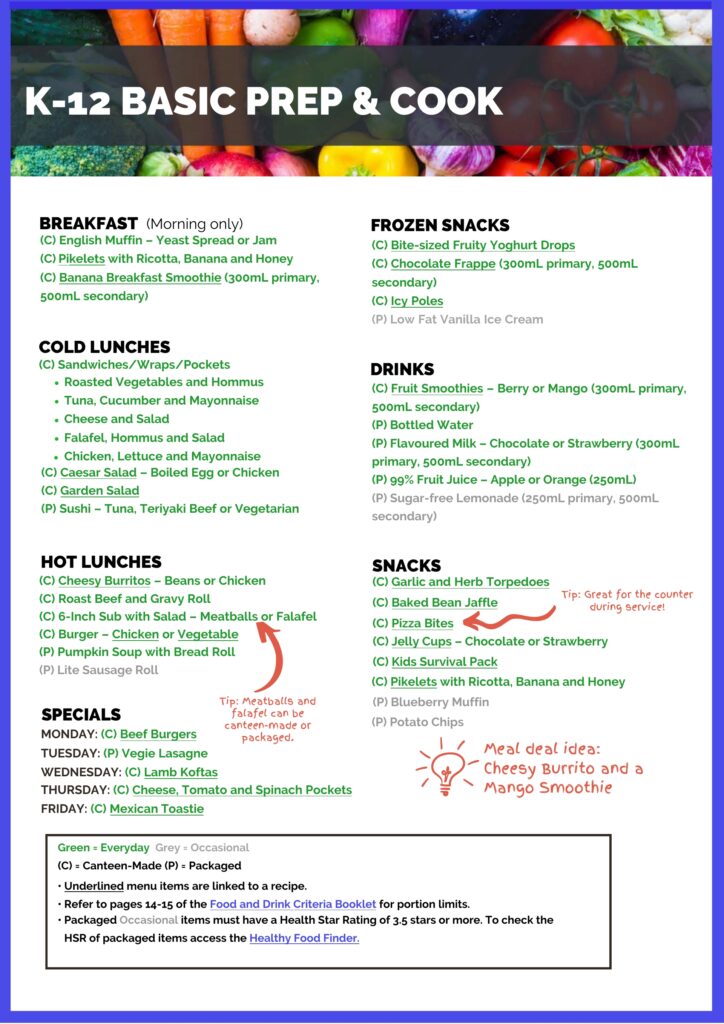 Please note: These menus are designed to provide an example of what your menu could contain. Each school is different and some items or sections may not be apply to your school.