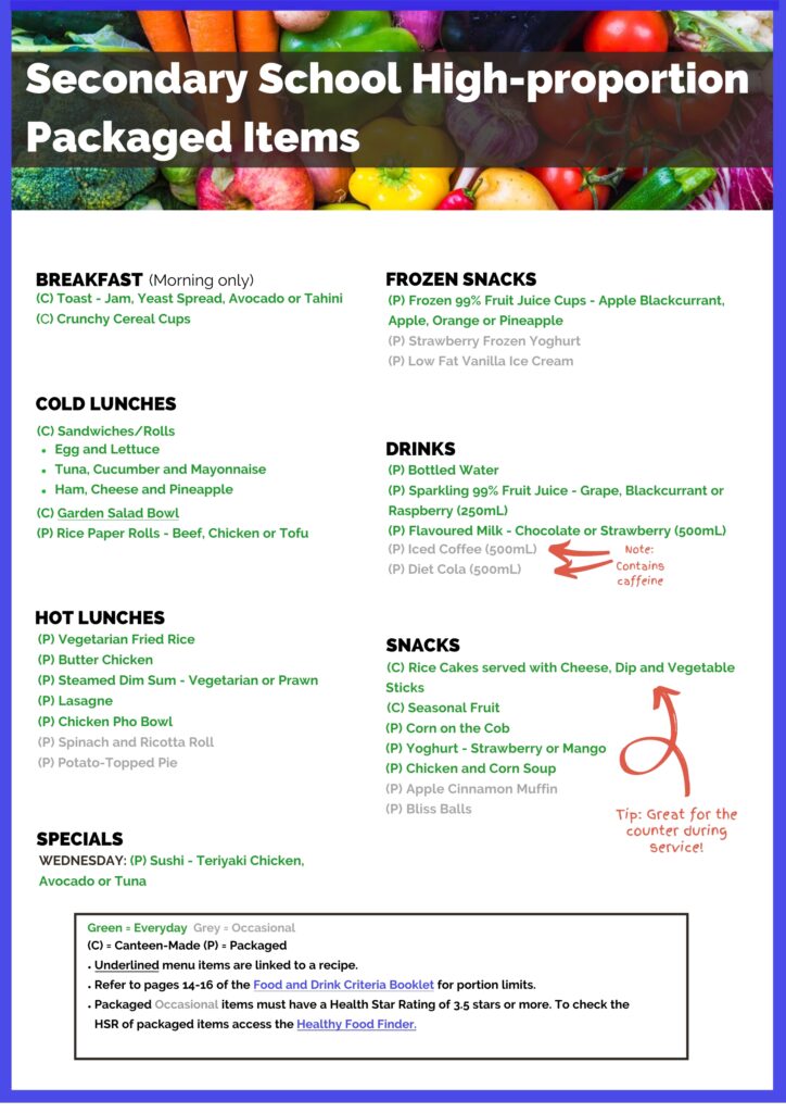 You can download a template and use as is or you can change menu items for your own canteen. The items in green are Everyday products and therefore should be replaced with Everyday items. The items in grey are Occasional products and therefore should be replaced with Occasional items. For instance, you may choose to replace the blueberry muffin with bliss balls which is also Occasional.