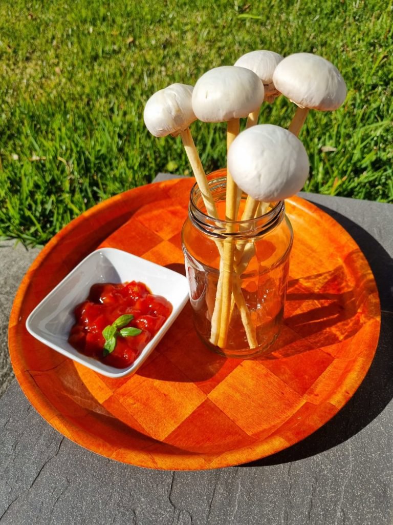 - Mushroom breadstick pops – dip the top of each breadstick into blended avocado/guacamole, tzatziki or hummus dip and add a de-stalked button mushroom to the top using the dip as the “glue”. Top with a dollop of salsa. Display for sale in a tall glass