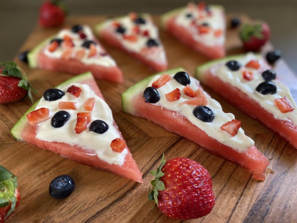 - Watermelon pizza slices – cut 2-3 cm slices from a watermelon. Cut the slices into ‘pizza’ shaped triangles. Spoon yoghurt over the watermelon slices and top with chopped or small pieces of fruit. Modified from: https://www.wholesomeyum.com/recipes/watermelon-pizza-recipe/